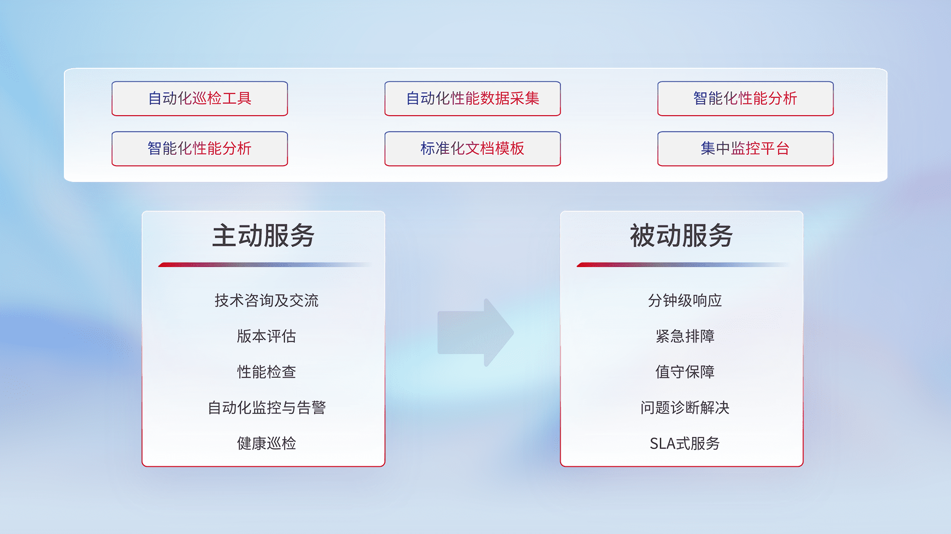 智能化工具和标准化文档,,,保障服务质量,,,,提供主动服务(包含技术咨询、、、、版本评估、、、、性能检查、、自动化监控与告警、、、健康巡检)和被动服务包含(分钟级响应、、、、紧急排障、、值守保障、、、、问题诊断解决、、、、SLA服务)。。。。
